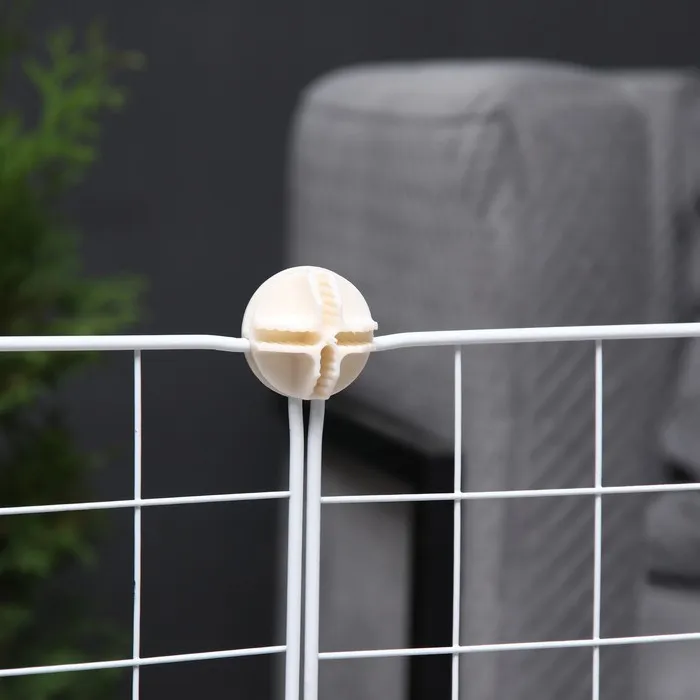 Вольер имеет две скользящие защелки с надежным замком, что означает, что ваш домашний любимец не сможет самостоятельно открыть дверцы вольера. Панели вольера надежно скрепляются соединительными стержнями по всей длине.