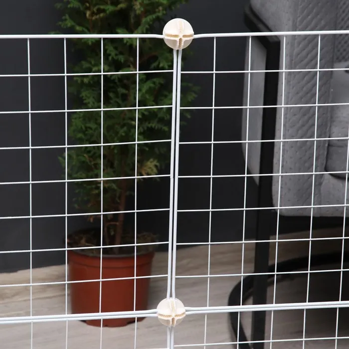 Вольер (клетка) сделан из негнущихся металлических секций, его можно быстро собрать и разобрать на открытом воздухе или в квартире без каких-либо дополнительных инструментов. Съемная конструкция складных перегородок разборного домика позволяет формировать квадратную, прямоугольную или любую неправильную форму.