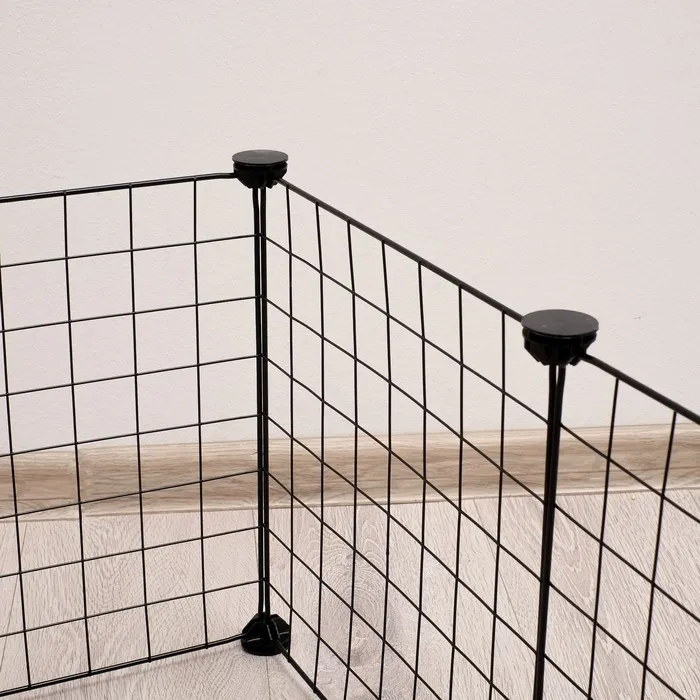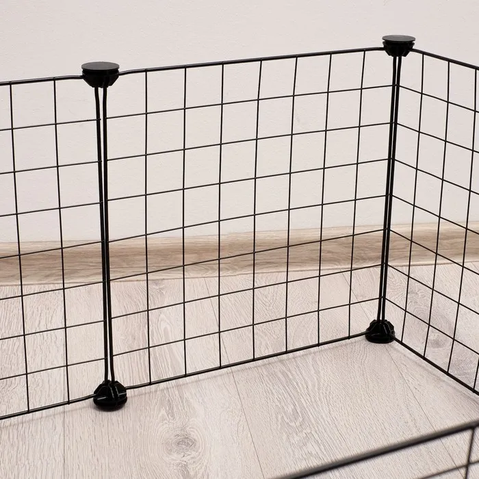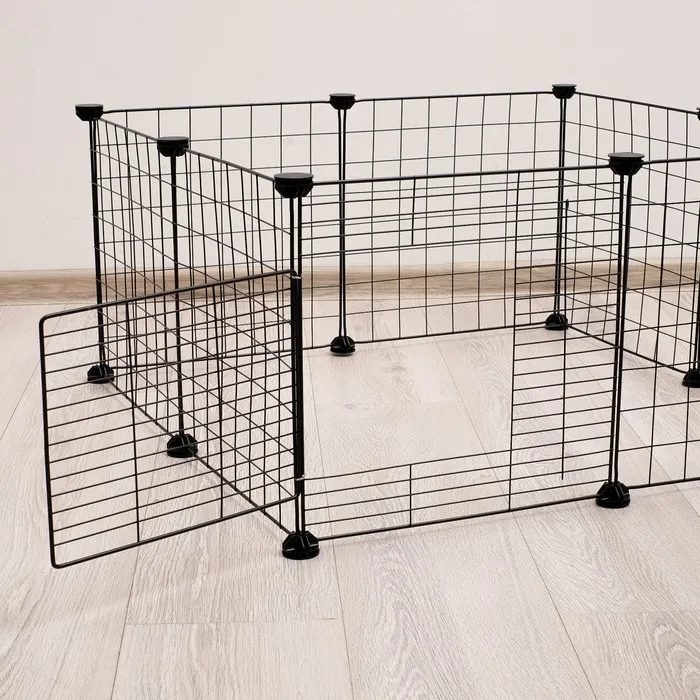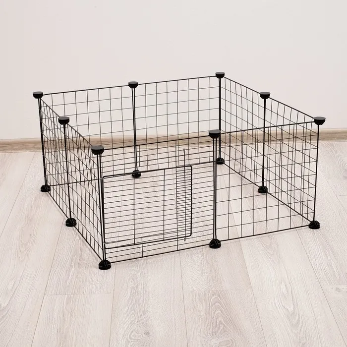 Вольер (клетка) сделан из негнущихся металлических секций, его можно быстро собрать и разобрать на открытом воздухе или в квартире без каких-либо дополнительных инструментов. Съемная конструкция складных перегородок разборного домика позволяет формировать квадратную, прямоугольную или любую неправильную форму.