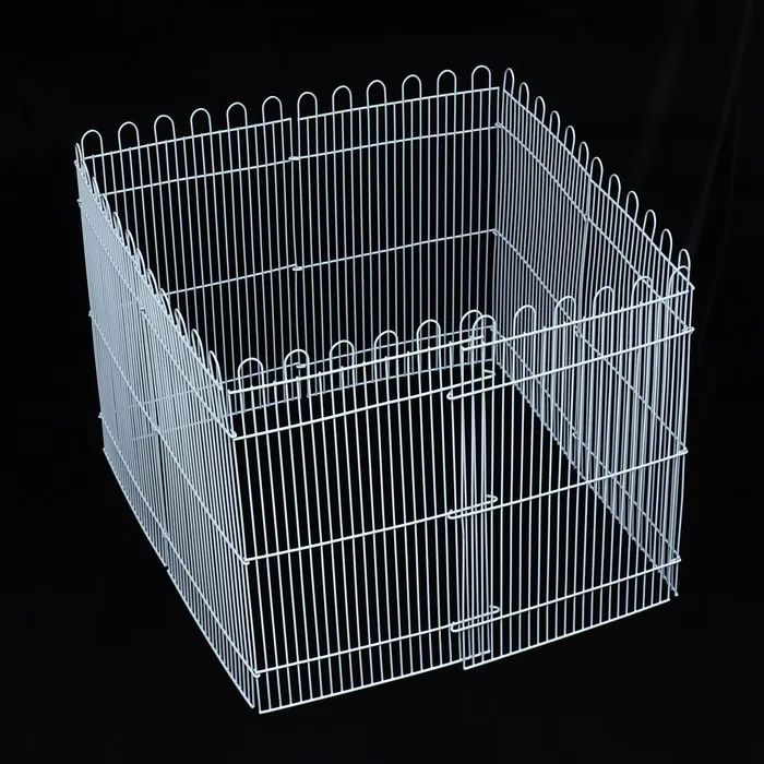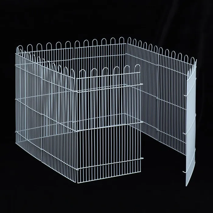 Вольер (клетка) сделан из негнущихся металлических секций, его можно быстро собрать и разобрать на открытом воздухе или в квартире без каких-либо дополнительных инструментов. Съемная конструкция складных перегородок разборного домика позволяет формировать квадратную, прямоугольную или любую неправильную форму.