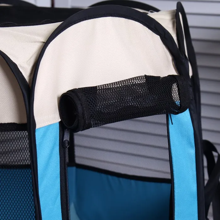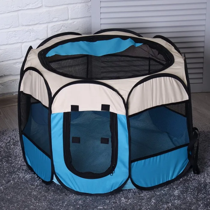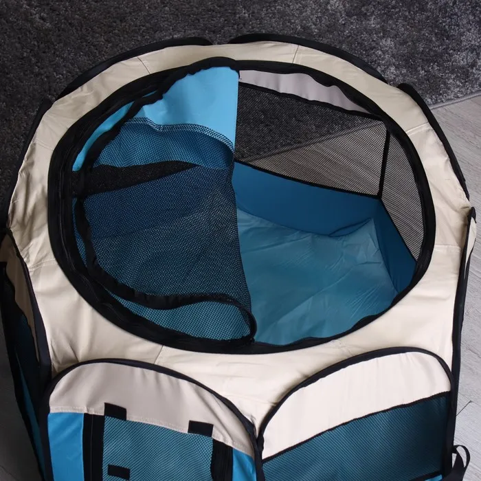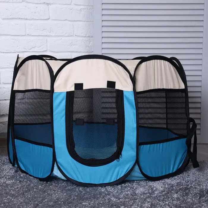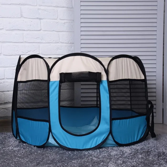 Тентовый вольер для животных голубого цвета — это удобное и практичное решение для временного содержания питомцев. С его помощью вы создадите безопасное и комфортное пространство для собак, кошек или других небольших животных. Идеально подходит для использования дома, на даче или во время поездок.