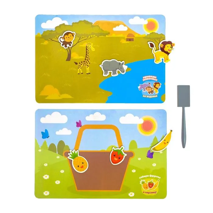 Фигурки притягиваются к жезлу благодаря встроенным магнитам. Ребёнок будет двигать его по игровому полю, вместе с ним перемещать фигурки и выполнять задания с карточек.