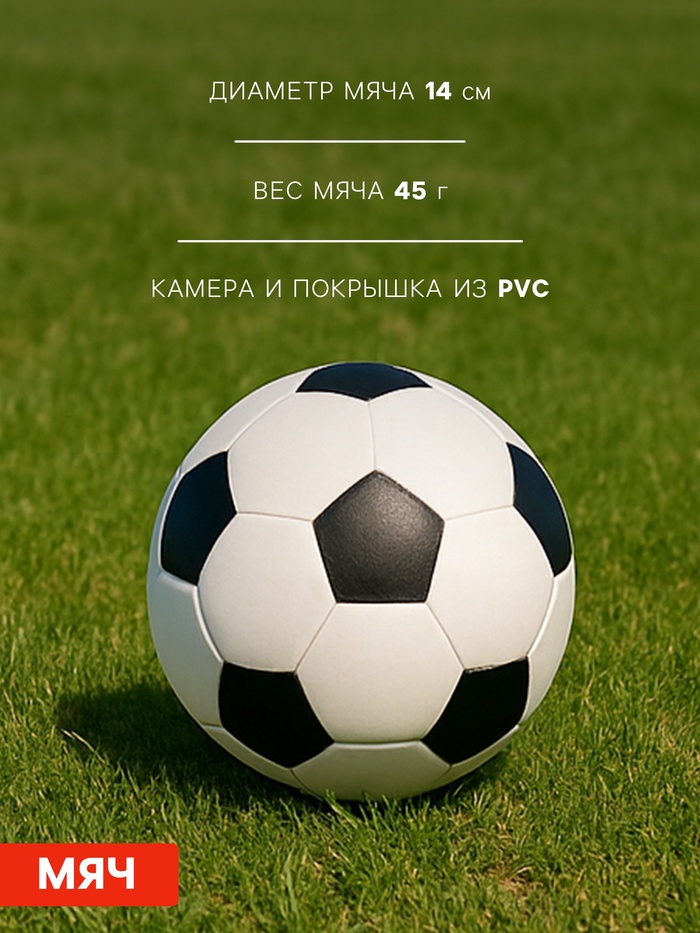 - Диаметр мяча 14 см, камера и покрышка из PVC, вес мяча 45 гр.