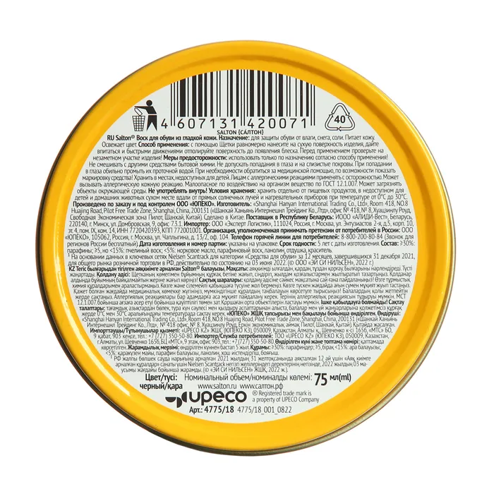 Воск для обуви "Salton" с норковым маслом черного цвета деликатно и комплексно ухаживает за обувью из гладкой кожи: смягчает ее, восстанавливает цвет, придает естественный блеск после полировки, защищает от негативного воздействия влаги, соли и снега.