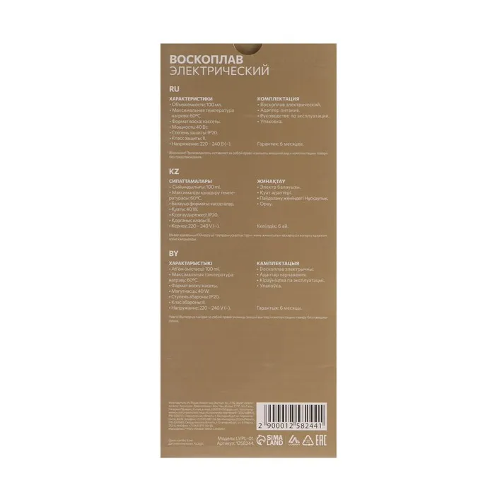 Воскоплав Luazon LVPL-01, кассетный, 1 кассета, 40 Вт, нагрев до 60 °C, 220 В, белый — Характеристики