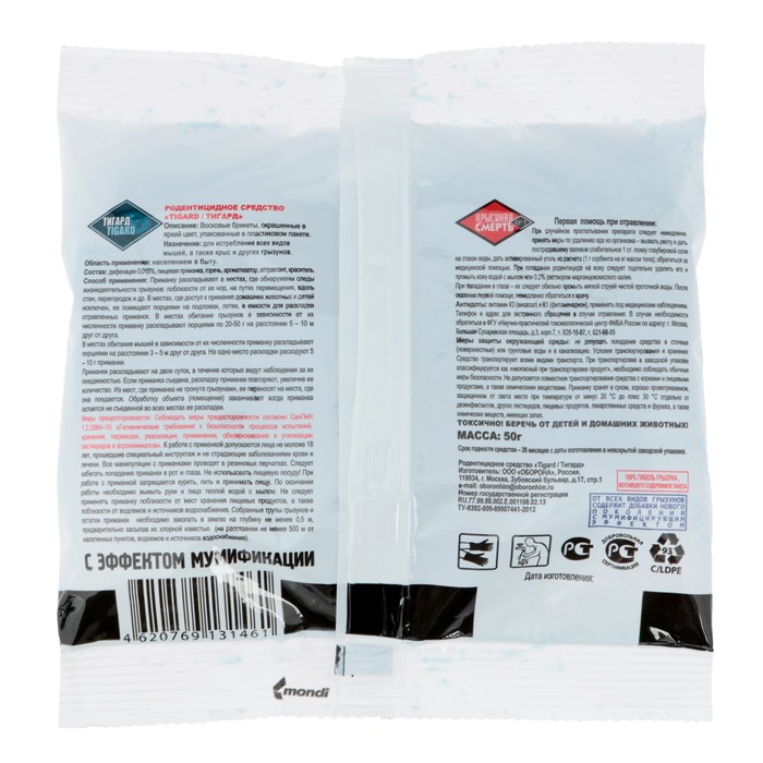 Высокоэффективное средство борьбы с мышевидными грызунами - достаточно однократного поедания. Обладает высокой привлекающей способностью для крыс и мышей. Активно даже в отношении грызунов, не чувствительных к другим ядам. Вызывает удушье мышей и крыс - гибель наступает, как правило, на открытых местах, а не в норах. Эффект мумификации избавит вас от неприятных запахов ! Средство предназначено для борьбы с крысами и мышами в жилых и нежилых помещениях различного назначения (пищевые, коммунально-бытовые, лечебные и детские учреждения, исключая места доступные детям.