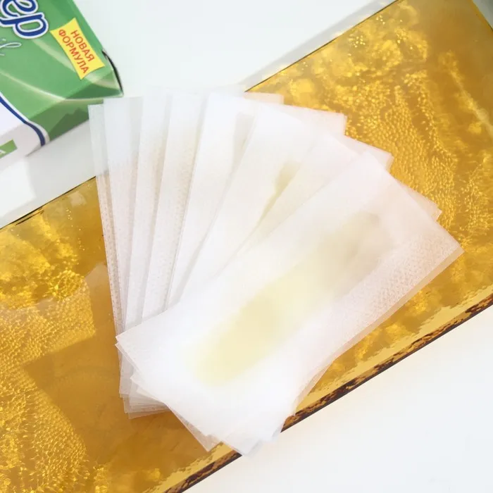 - Разъедините склеенные между собой полоски и наклейте их на кожу, разглаживая по направлению роста волос.