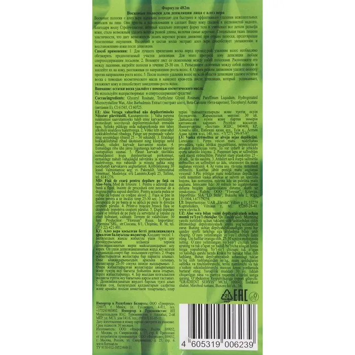 Floresan deep depil восковые полоски для депиляции лица с алоэ вера - предназначены для простого, быстрого и эффективного удаления нежелательных волос. Препятствуют формированию вросших волос, снижают интенсивность их роста. Входящие в состав натуральные компоненты, увлажняют, и смягчают обработанную поверхность, уменьшают и предотвращают появление покраснений и раздражений на нежной и чувствительной коже.