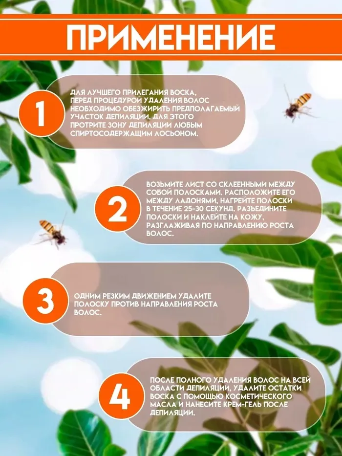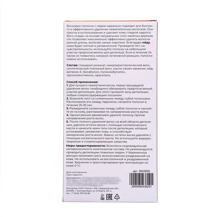 Восковые полоски с мёдом идеально подходят для быстрого и эффективного удаления нежелательных волосков на любом участке тела. Они просты в использовании и сделают кожу гладкой надолго. Воск создан на основе натуральных смол хвойных дереьев, что позволяет максимально эффективно удалять волоски разной длины, включая самые короткие. Благодаря мёду и витамина Е, кожа будет мягкой и увлажненной. Проведите тест на чувствительность: используйте полоску на небольшом участке предполагаемом для депиляци. Если в течение 24 часов не появилось никакой негативной реакции, полоски можно использовать.