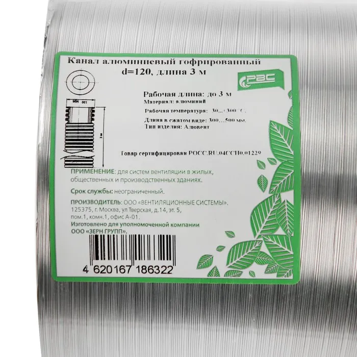 Воздуховод гофрированный «РВС», d=120 мм, раздвижной до 3 м, алюминиевый — Характеристики