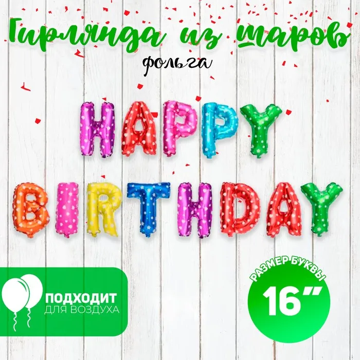 Воздушные шары фольгированные 16", гирлянда Happy Birthday, разноцветная — Характеристики
