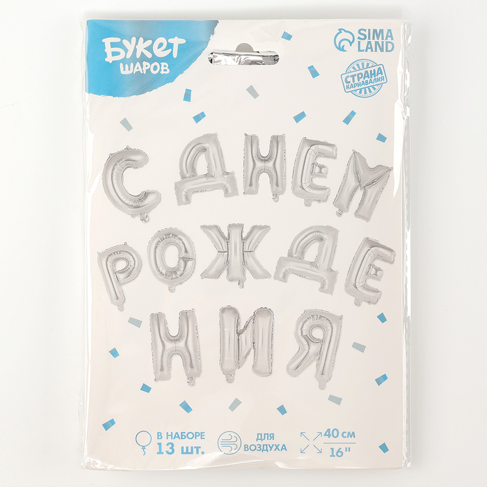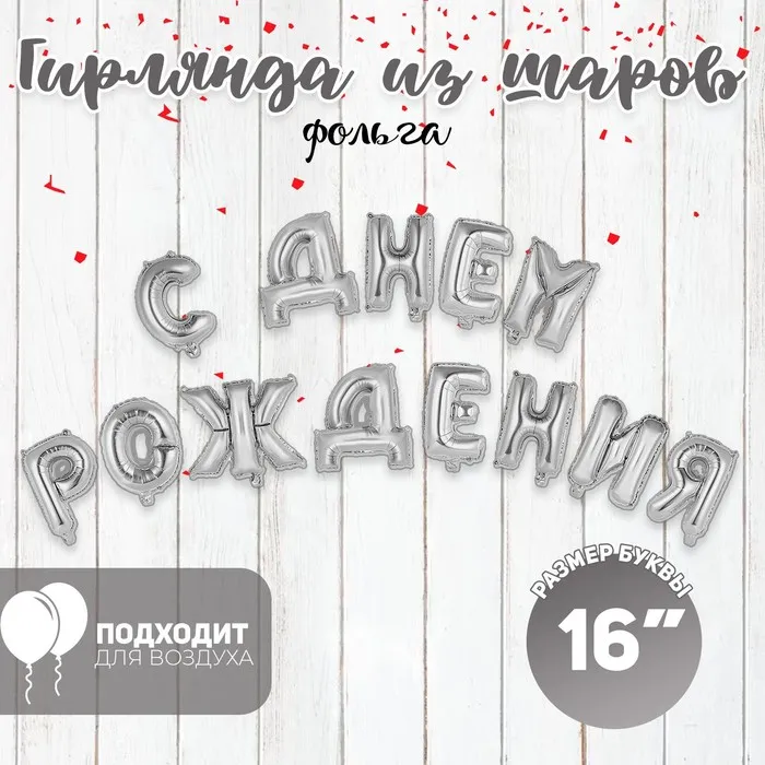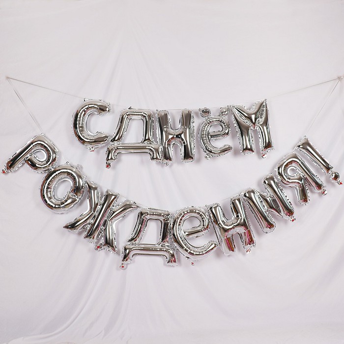 Воздушные шары фольгированные 16", гирлянда «С днём рождения», серебряная — Характеристики