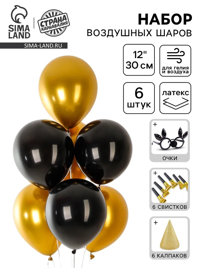 Воздушные шары, набор «Вечеринка»: 6 шаров, 6 свистков, 6 колпаков, очки — Характеристики