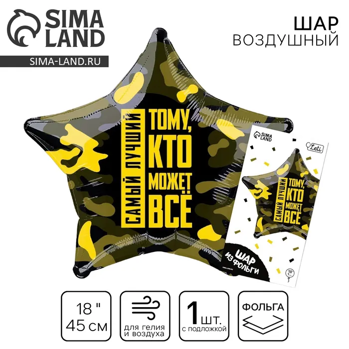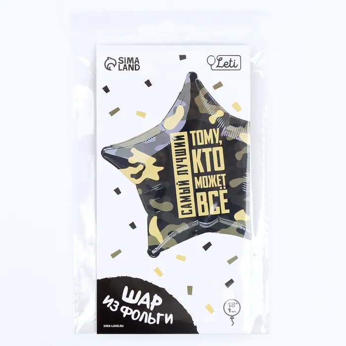Фольгированный шар в виде звезды с надписями: «Самый лучший» и «Тому, кто может всё» можно использовать в качестве дополнения к подарку любимому мужчине, парню или мальчику. Оформление в стиле камуфляжа подходит для оформления помещения для празднования Дня защитника Отечества.