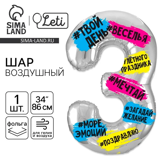 Стильный и эффектный фольгированный шар в форме цифры «3» станет отличным украшением для любого торжества. Его можно использовать как самостоятельный декор или сочетать с другими цифрами для создания значимой даты.