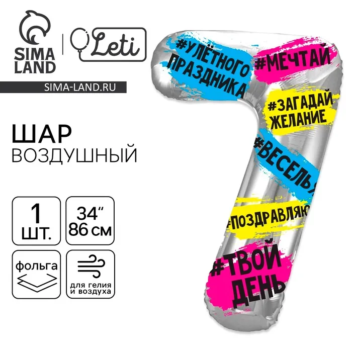 Стильный и эффектный фольгированный шар в форме цифры «7» станет отличным украшением для любого торжества. Его можно использовать как самостоятельный декор или сочетать с другими цифрами для создания значимой даты.