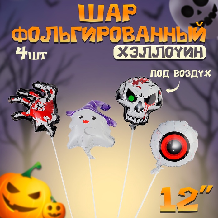 Воздушные шары фольгированные 12", набор «Хеллоуин», 4 шт., для палочки
