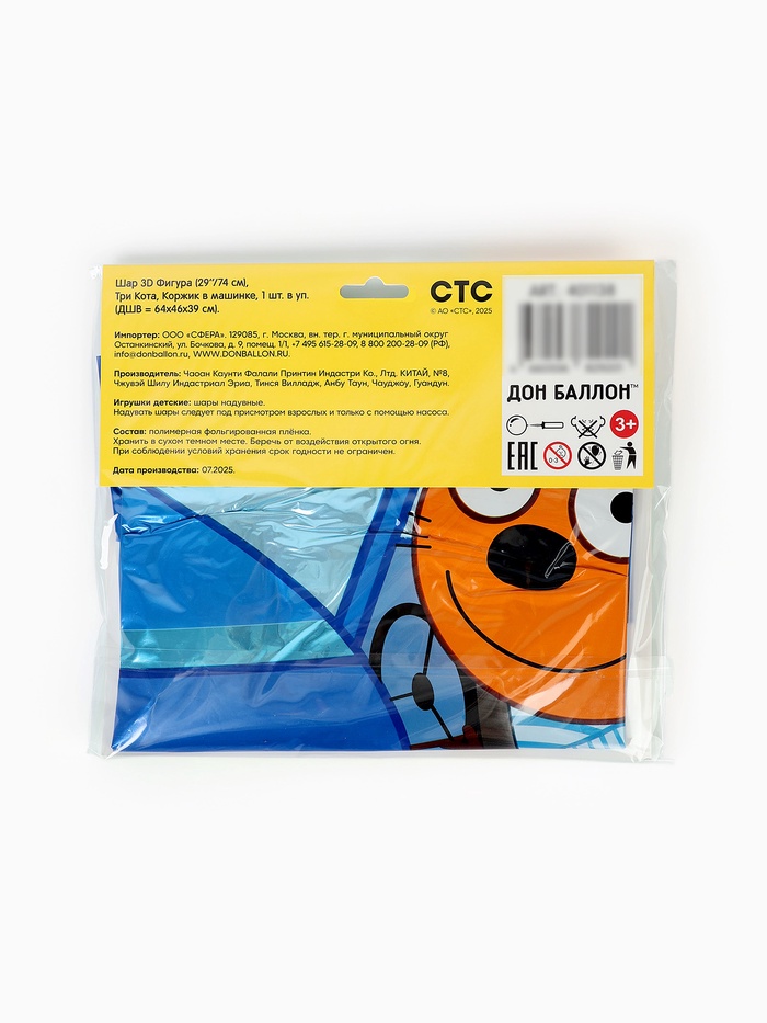 Воздушный шар фольгированный 3D 29" «Три Кота. Коржик в машине», только под воздух — Характеристики