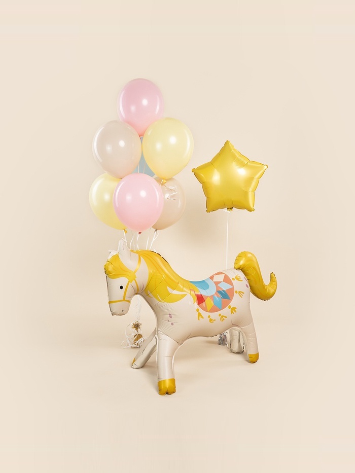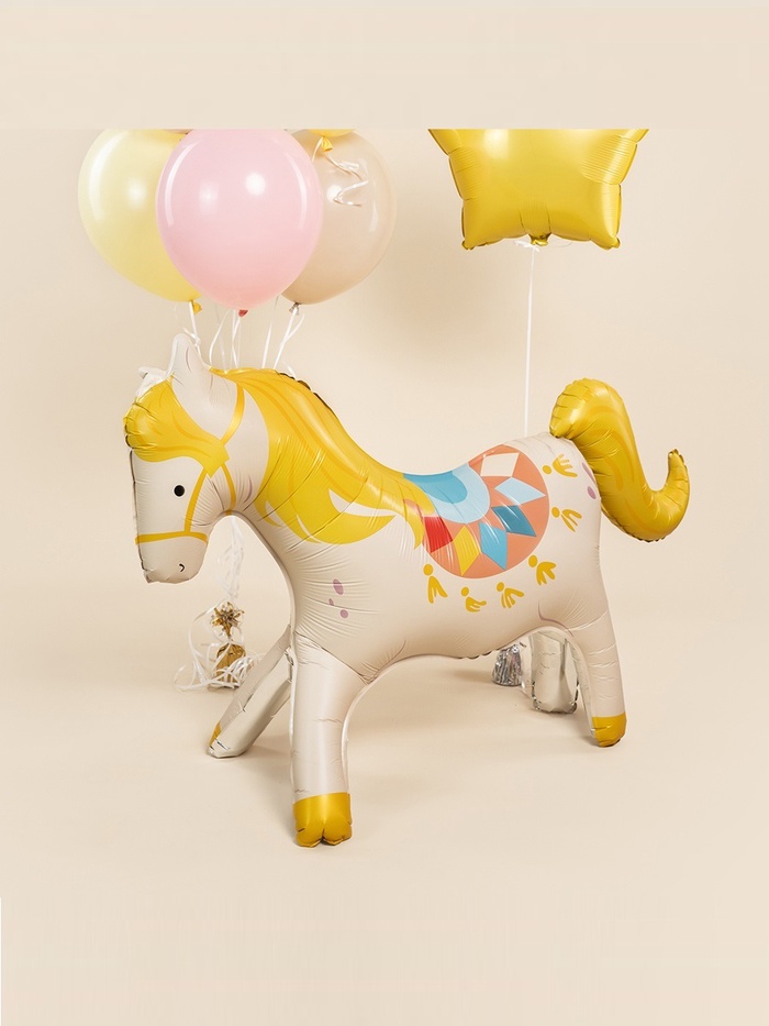 Фольгированный 3D-шар «Любимая лошадка из цирка» — не декор, а маленький спектакль, остановившийся на мгновение. Бежевый матовый силуэт с мягкими контурами и тёплым блеском фольги напоминает цирковую артистку в костюме из пыли и аплодисментов: скромную — но незабываемую.