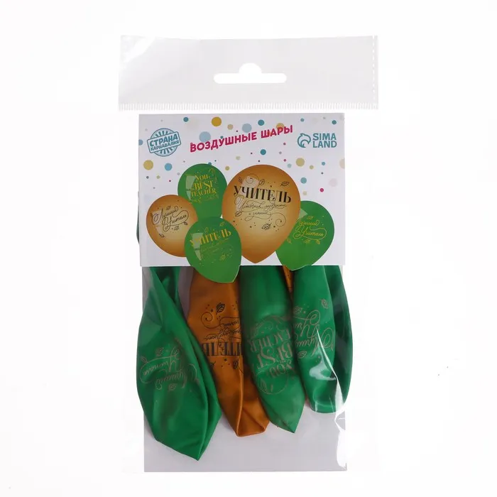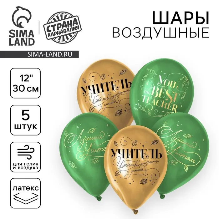 Воздушный шар латексный 12" "Лучший учитель", золото, зеленый, 5 шт. — Характеристики