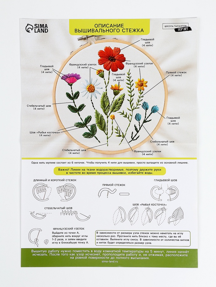 - В инструкции подробно описаны стежки и варианты закрепления нити, которые можно использовать во время творческого процесса.
