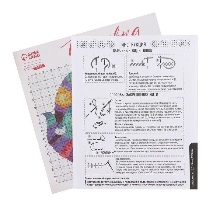 - В инструкции подробно описаны стежки и варианты закрепления нити, которые можно использовать во время творческого процесса.