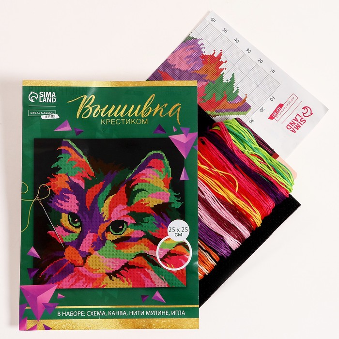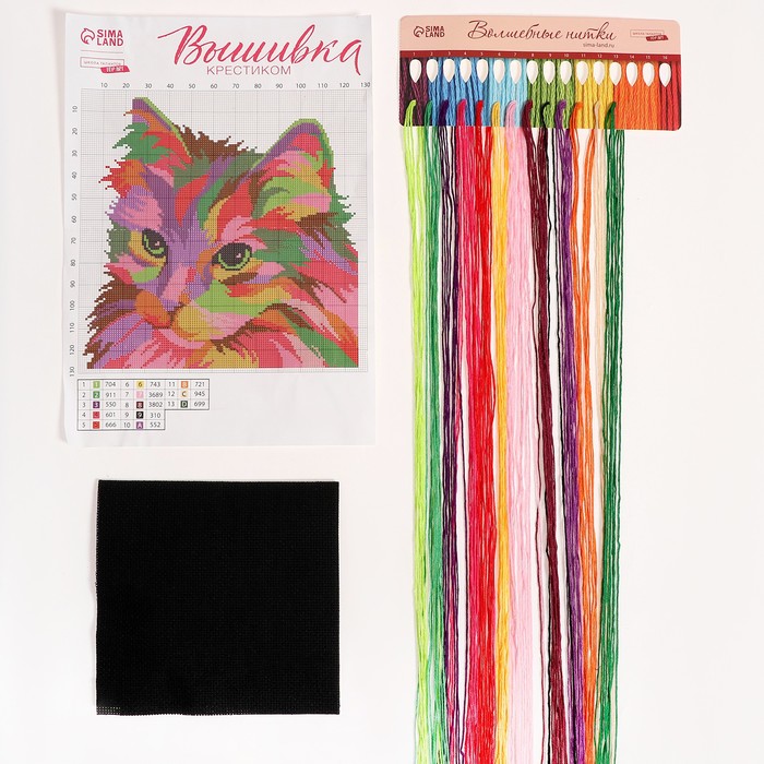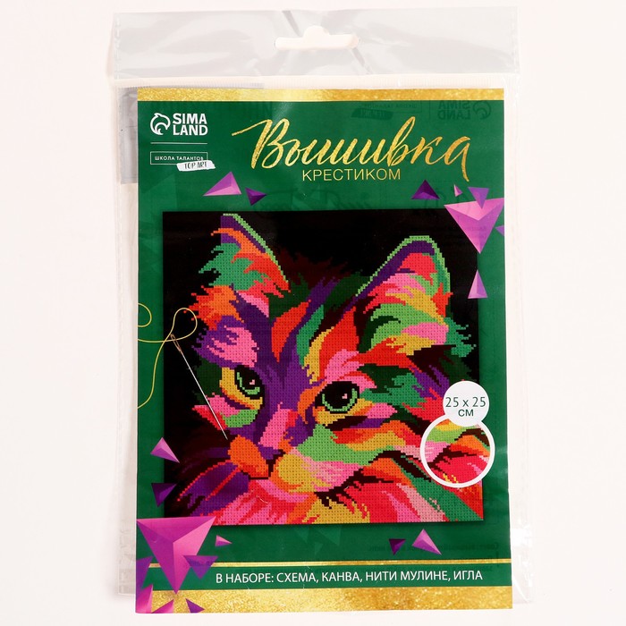 Вышивка крестиком на чёрной канве «Разноцветный кот», набор для творчества, 25 х 25 см — Характеристики