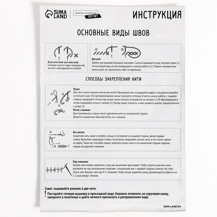 - В инструкции подробно описаны стежки и варианты закрепления нити, которые можно использовать во время творческого процесса.