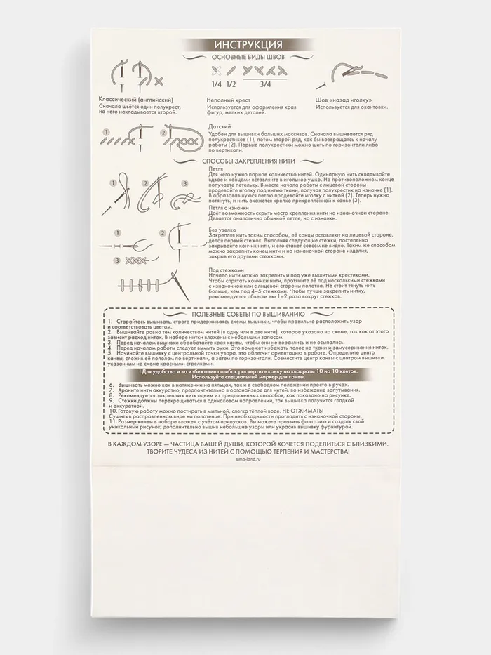 - В инструкции подробно описаны стежки и варианты закрепления нити, которые можно использовать во время творческого процесса.