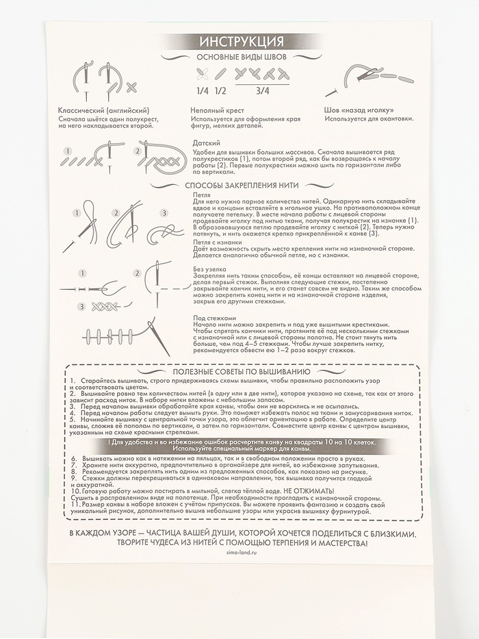 - В инструкции подробно описаны стежки и варианты закрепления нити, которые можно использовать во время творческого процесса.