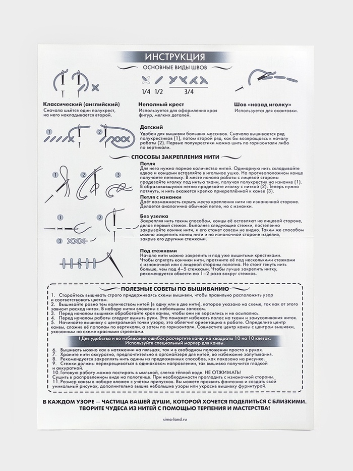 - В инструкции подробно описаны стежки и варианты закрепления нити, которые можно использовать во время творческого процесса.