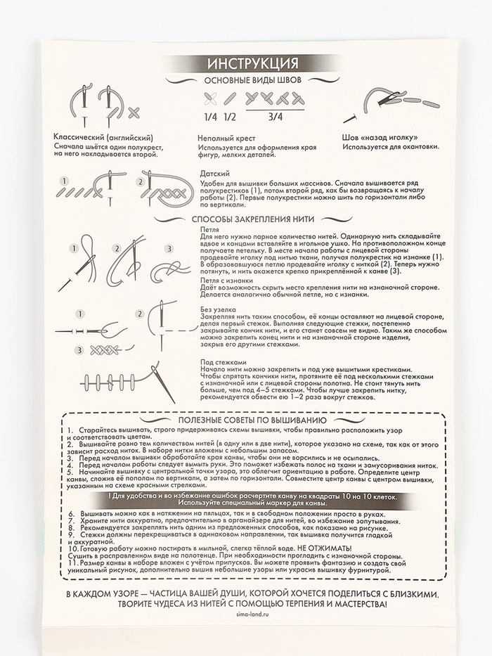 - В инструкции подробно описаны стежки и варианты закрепления нити, которые можно использовать во время творческого процесса.