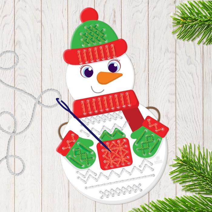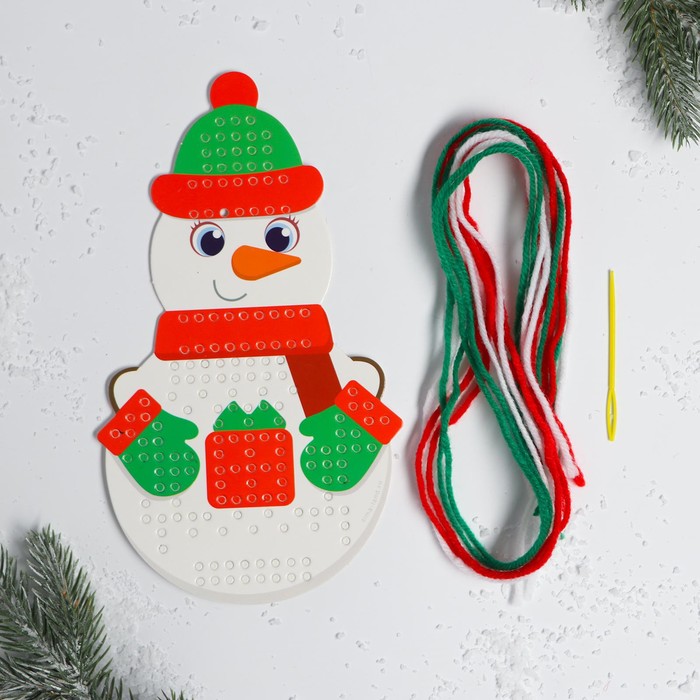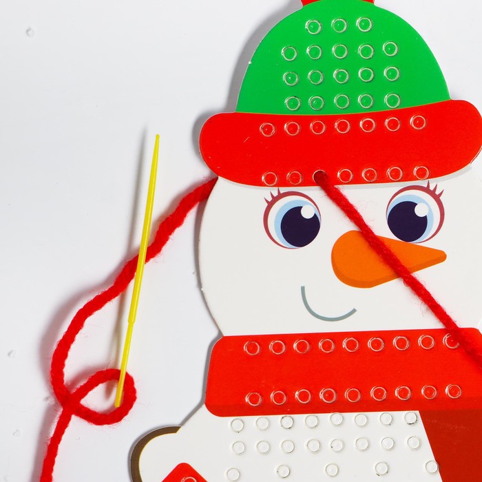 Вышивка пряжей на новый год «Снеговик» на картоне с пластиковой иглой, набор для творчества — Характеристики