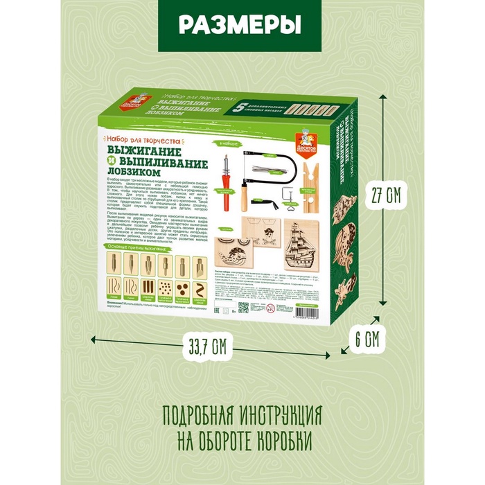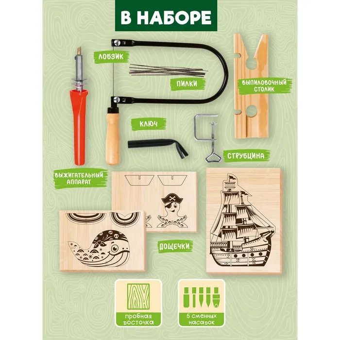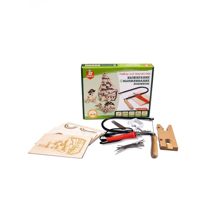 - В набор входят инструменты для выжигания и выпиливания, что позволяет ребёнку попробовать себя в двух разных ремеслах.