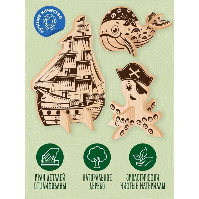 - В комплекте три простые модели пирата, корабля и кита, которые ребёнок сможет выпилить самостоятельно или с небольшой помощью взрослого.