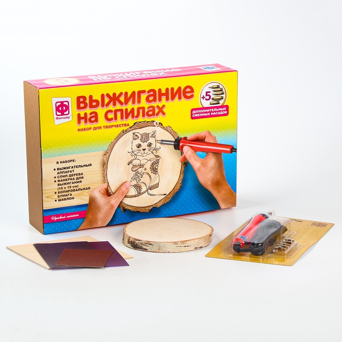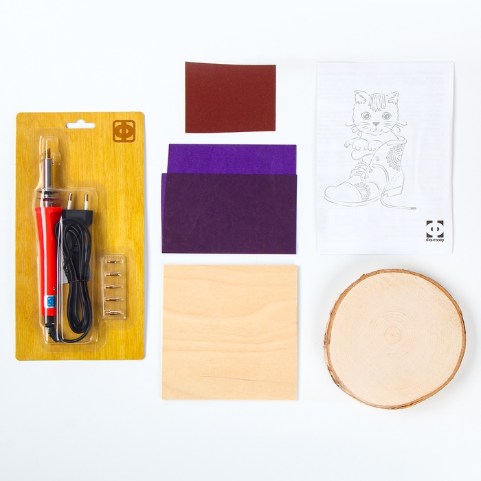 Выжигание по дереву: аппарат с насадками, доски 3 шт., спил 1 шт., набор для творчества