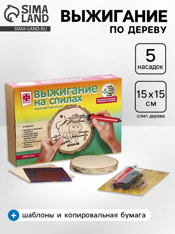 Выжигание по дереву: аппарат с насадками, доски 3 шт., спил 1 шт., набор для творчества