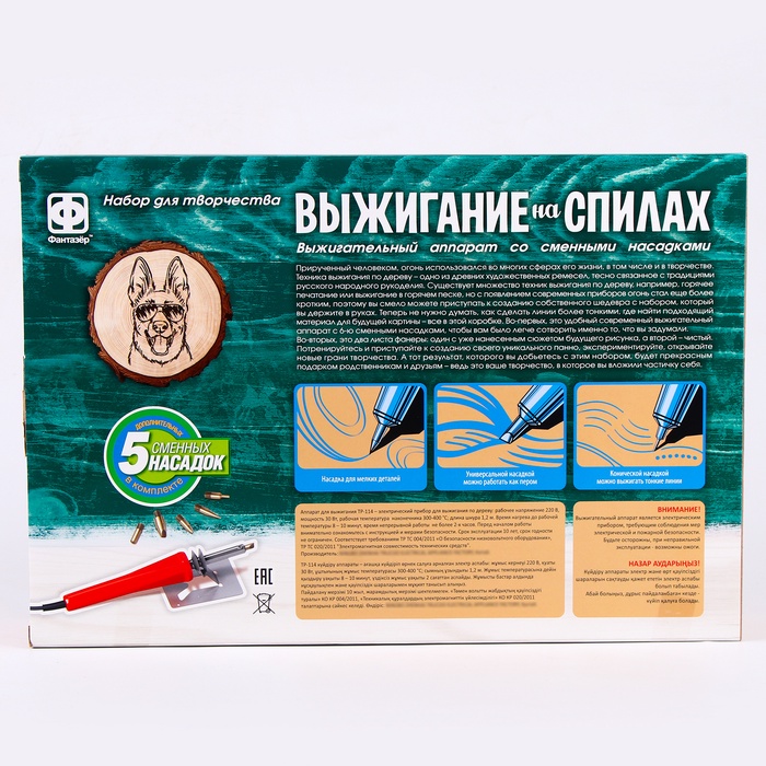 Современный выжигательный аппарат в комплекте с разнообразными насадками позволяет рисовать линии различной толщины и формы, что делает процесс творчества не только интересным, но и точным.