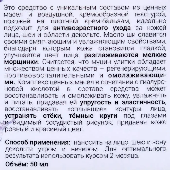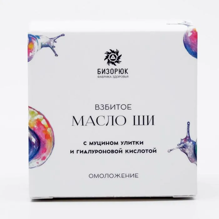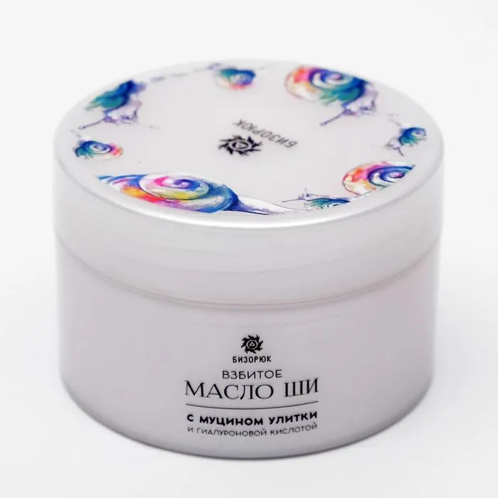 Взбитое масло ши Бизорюк с муцином улитки и гиалуроновой кислотой - это инновационный косметический продукт, созданный для омоложения и ухода за кожей. Он сочетает в себе ценные свойства масла ши, муцина улитки и гиалуроновой кислоты, чтобы обеспечить вашей коже увлажнение, питание и омолаживающий эффект.