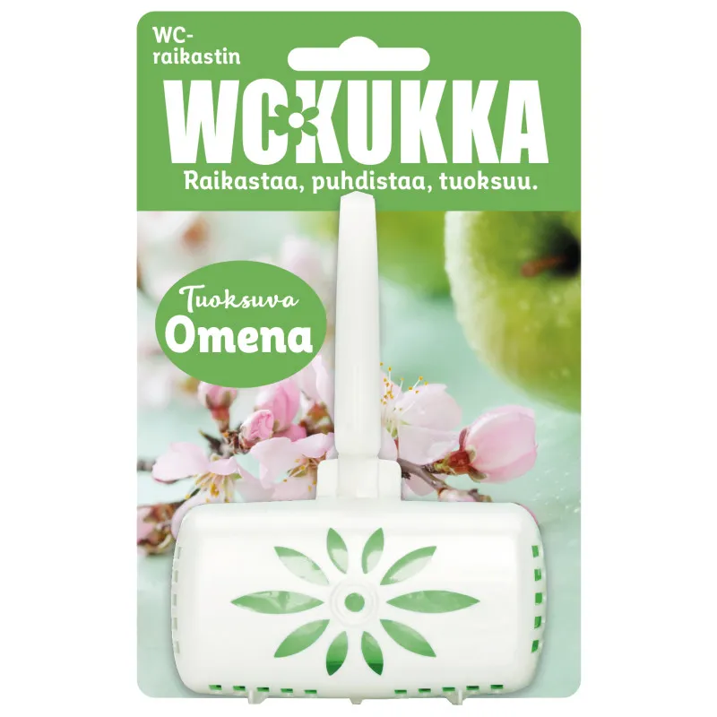WC-Kukka – удобный освежитель для туалета, который крепится на край унитаза. Обеспечивает чистоту и гигиену на протяжении около 4 недель с приятным ароматом свежего яблока. Упаковка 50 г.