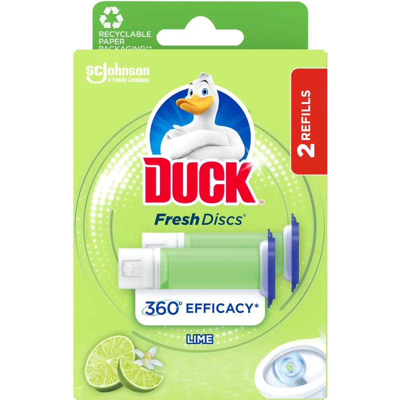 Duck Fresh Discs — это гигиеничный освежитель для унитаза, который не содержит держателя, собирающего микробы. Продукт образует самоклеящийся гелевый диск одним нажатием, который легко крепится к любой поверхности, мокрой или сухой. Уникальный диск эффективно освежает и очищает с каждым смыванием, предотвращая образование известкового налета. Аромат свежего лайма наполнит ваш туалет приятной свежестью.