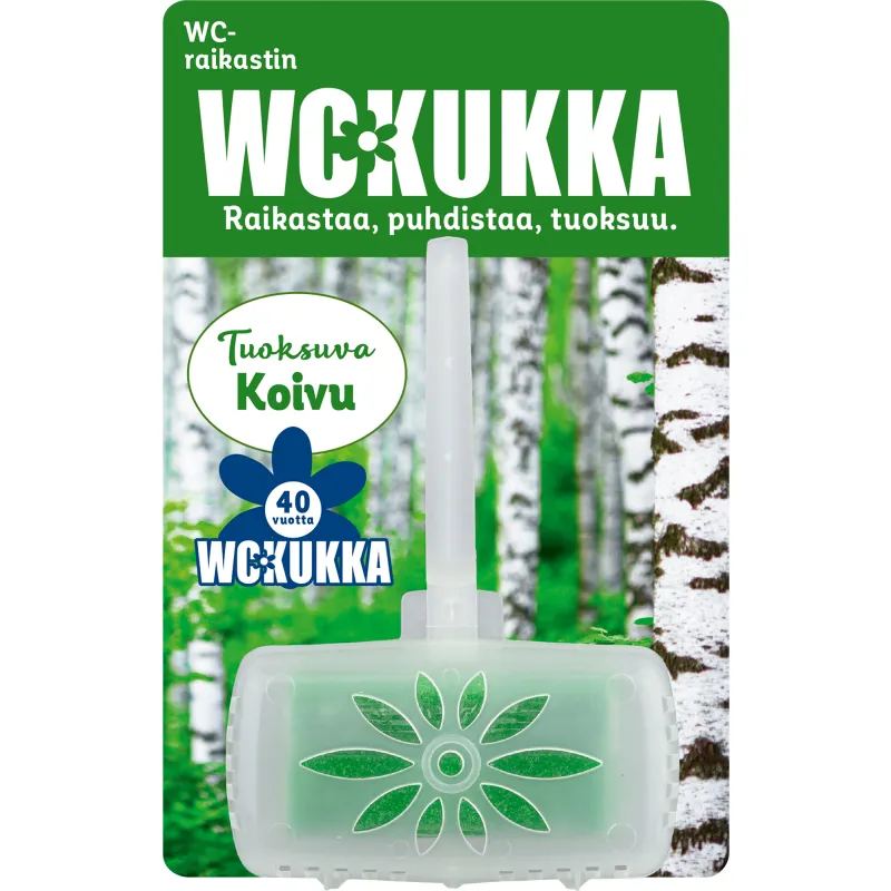 WC Kukka Koivu - это освежитель для туалета, который очищает и освежает унитаз с каждым смыванием. Он предотвращает образование известковых отложений и устраняет неприятные запахи. Освежитель имеет приятный аромат березы. Упаковка весом 50 г. Мы постоянно обновляем информацию о продукте, но всегда рекомендуем проверять данные на упаковке.
