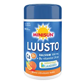 Витамин D3 + кальций Minisun Luusto - препарат, который содержит кальций и витамин D для поддержки здоровья костей. Витамин D усиливает сопротивляемость костного скелета и является важным витамином для здоровых костей, мышц и зубов. Доказано,что потребление витамина D может помочь предотвратить многие заболевания, такие как: рак, сахарный диабет, ревматоидный артрит, рассеянный склероз, грипп, используется так же для профилактики переломов. Витамин D и кальций являются важными добавками в ежедневном рационе.
