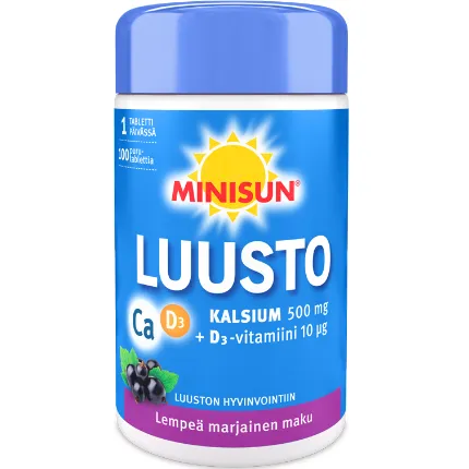 Витамин D3 + кальций Minisun Luusto - препарат, который содержит кальций и витамин D для поддержки здоровья костей. Витамин D усиливает сопротивляемость костного скелета и является важным витамином для здоровых костей, мышц и зубов. Доказано,что потребление витамина D может помочь предотвратить многие заболевания, такие как: рак, сахарный диабет, ревматоидный артрит, рассеянный склероз, грипп, используется так же для профилактики переломов. Витамин D и кальций являются важными добавками в ежедневном рационе.