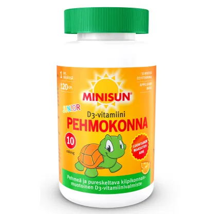 Minisun Pehmokonna Junior витамин со вкусом апельсина в форме черепашек. D3 является важным фактором для укрепления костной ткани, зубов, так же улучшает усвоение кальция и фосфора.