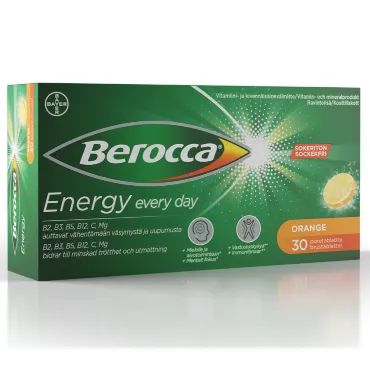 Berocca Energy поддерживает работу мозга и помогает вам оставаться в тонусе каждый день. Применяется для поддержки организма в периоды интенсивных физических и психо-эмоциональных нагрузок. Шипучие таблетки быстро растворяются в воде и содержат 11 основных витаминов и минералов, в том числе несколько витаминов группы В: витамины В1 и В2 помогают высвобождать энергию из пищи, витамины В3 и В6 уменьшают усталость, а витамин В5 поддерживает умственную работоспособность. Витамин С является антиоксидантом, который, помимо прочего, улучшает усвоение железа, влияет на метаболизм фолиевой кислоты и участвует в функции лейкоцитов. Витамин С способствует образованию соединительной ткани и необходим для формирования и функционирования зубов, костей и капилляров. Кальций важен для развития костей и зубов и необходим для функционирования нервной и костно-мышечной систем. Магний несет ответственность за наращивание белка, жировой обмен, сжигание сахара и клеточное дыхание. Цинк является важным строительным блоком многих белков и гормонов, который по-разному участвует в регулировании обмена веществ и функций организма.