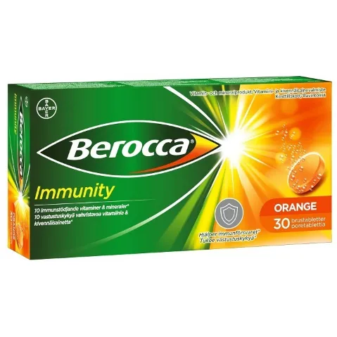 Berocca Immunity — это шипучие таблетки со вкусом апельсина, которые содержат 10 витаминов и минералов, повышающих сопротивляемость организма: витамины A, B6, B9, B12, C и D, а также селен, медь, железо и цинк для улучшения нормального функционирования иммунной системы. Витамины С и Е, селен, медь и цинк помогают защитить клетки от окислительного стресса.