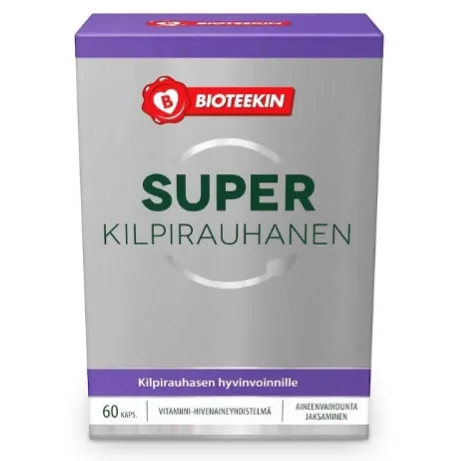 Bioteekin Super Kilpirauhanen - препарат содержит основные витамины и микроэлементы, необходимые для выработки и действия гормонов щитовидной железы. Йод и селен способствуют нормальной функции щитовидной железы. Витамин С помогает уменьшить усталость, истощение и способствует нормальному энергетическому обмену. Пантотеновая кислота способствует нормальному синтезу и метаболизму стероидных гормонов, витамина D и нейротрансмиттеров. Цинк способствует правильному функционированию иммунной системы и помогает защитить клетки от окислительного стресса.