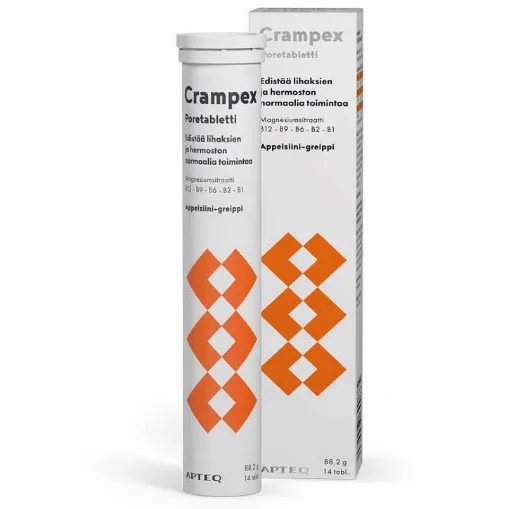 Apteq Crampex - это новая, уникальная и сильная комбинация хорошо усваиваемого цитрата магния и клинически подтвержденного витаминного комплекса B (витамин B12-B9-B6-B2-B1). Уникальный состав воздействует как на мышцы, так и на нервную систему. Цитрат магния способствует нормальному функционированию мышц и нервной системы. Витамины группы В способствуют нормальной работе нервной системы. Вкус апельсина и грейпфрута.