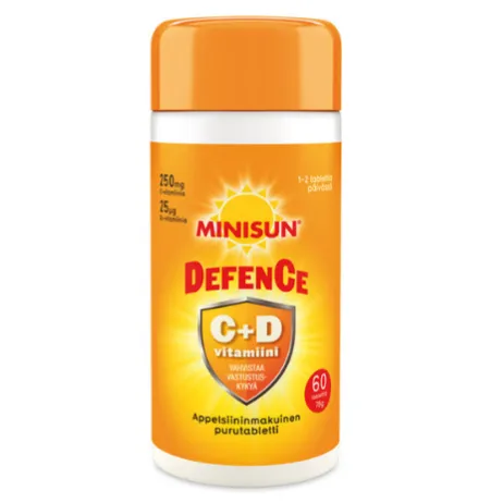 Minisun Defence - препарат содержит уникальное сочетание витаминов C и D в жевательной таблетке с приятным вкусом апельсина. Витамины C и D способствуют нормальной работе иммунной системы и тем самым укрепляют иммунитет. Так же употребление достаточного количества витаминов C и D является важным для укрепления костей. Витамин С снижает утомляемость и истощение, а витамин D важен для структуры костей и мышечной ткани. Потребность в витаминах увеличивается при длительной болезни, похудании, курении и воспалении.